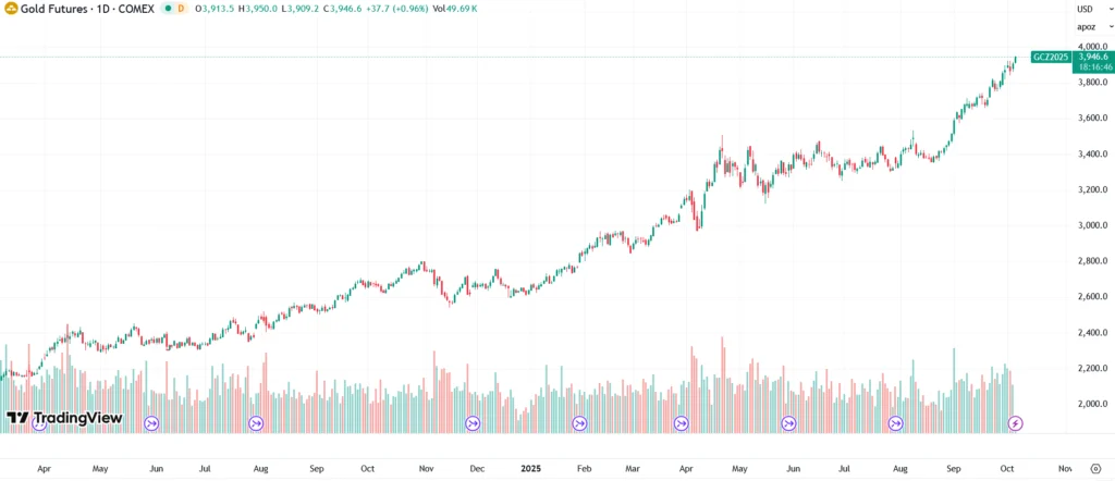 Comex gold futures priced in USD. Gold trades at $5,979/oz, record highs in Aussie terms.