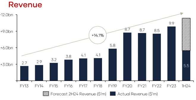 Eagers Automotive has had a great start to 2024. The first half revenue increased 13.4% over 2023 to $5.5 billion. The Underlying Operating EBITDA was up 4.6%. It was a record half year EBITDA result, which showed the benefits of recent acquisitions and spot on execution.